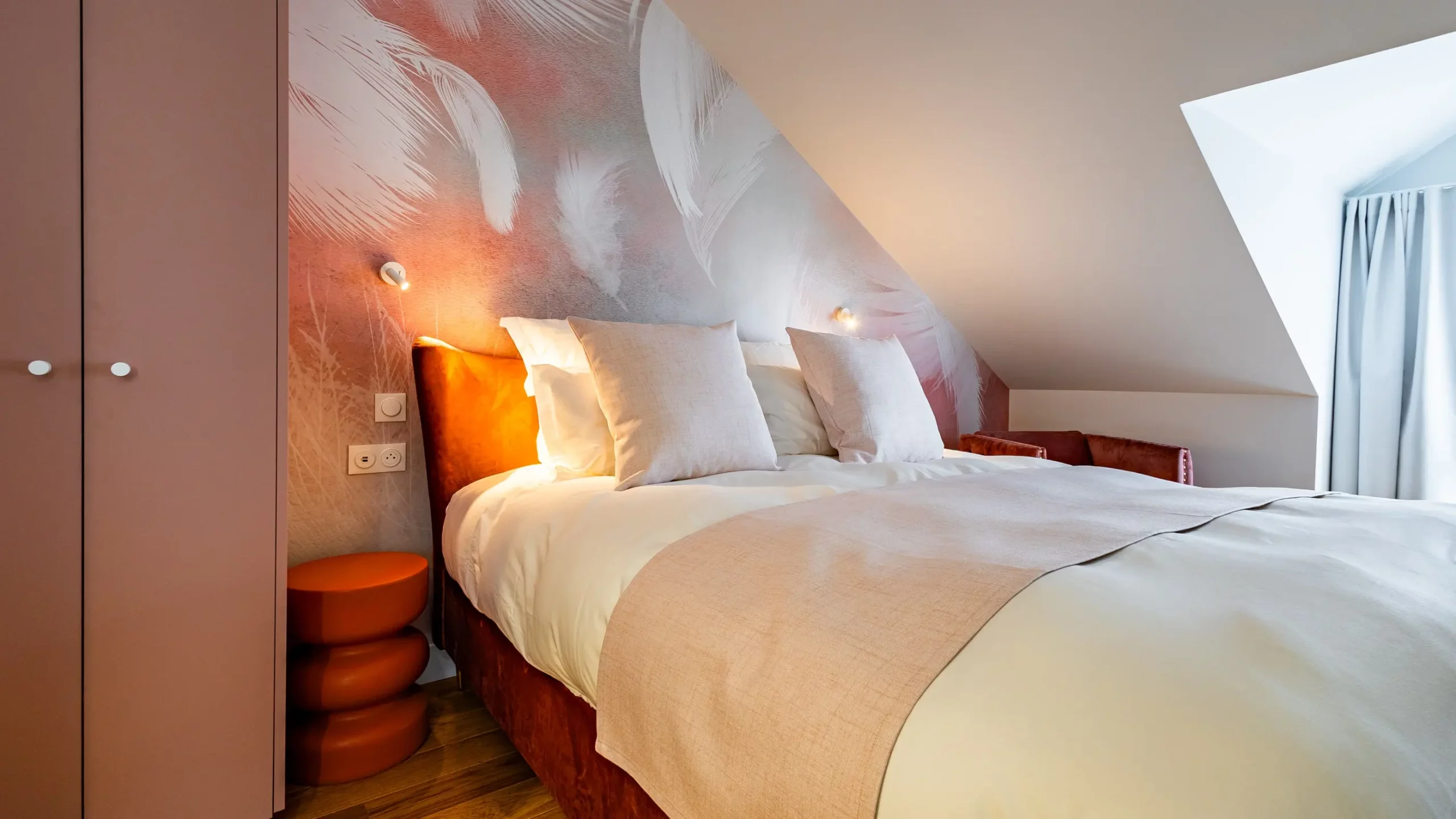 Cette chambre, aux tons rose poudré, vous enveloppe dans un cocon de velours. Son côté Glam est le parfait écrin pour une nuit douce et apaisante.