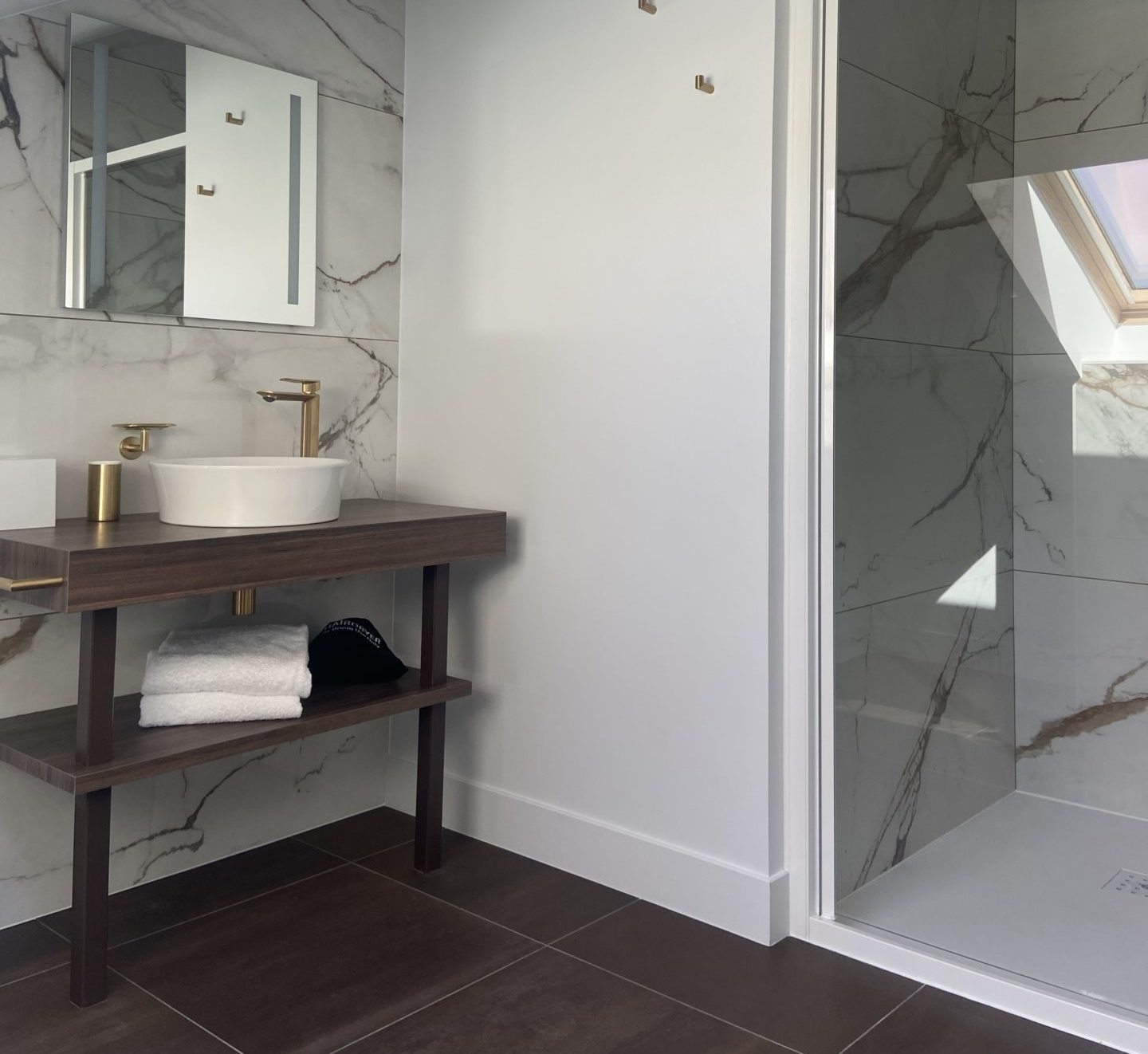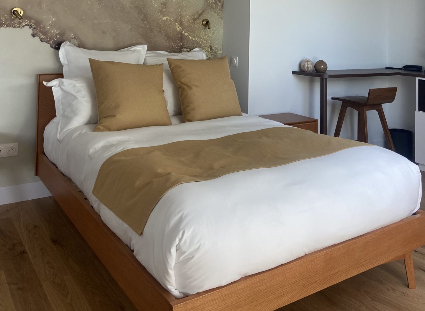 Élégante et sereine, cette chambre associe des tons marron clair, du marbre et des touches dorées, accompagnée d’un lit bas pour une expérience zen.